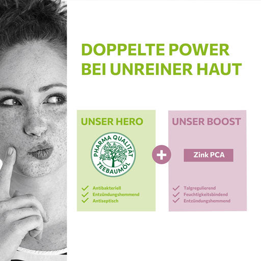 100% pure, pharmaceutical-quality Australian tea tree oil - known for its diverse and natural effectiveness + Zinc PCA - known for its sebum-regulating, moisture-binding and anti-inflammatory effects