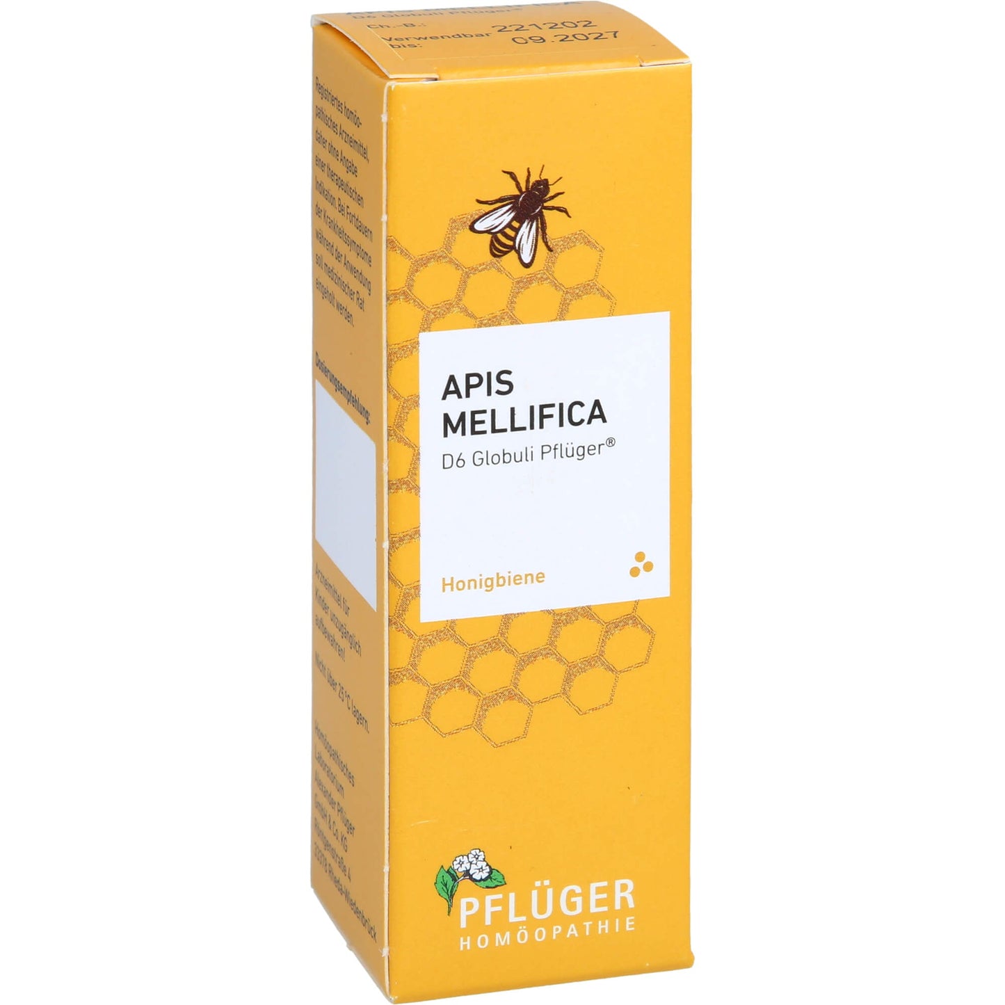 Apis mellifica D6 Globuli Pflüger®, Composition: 10 g of globules contain: Active ingredient: Apis mellifica Dil. D6 0.1 g. Other ingredient: Sucrose. Registered homeopathic medicinal product, therefore no therapeutic indication is specified. Contraindications/Side effects: None known. Contains sucrose. Consult the package insert. For risks and side effects, read the package insert and ask your doctor or pharmacist.