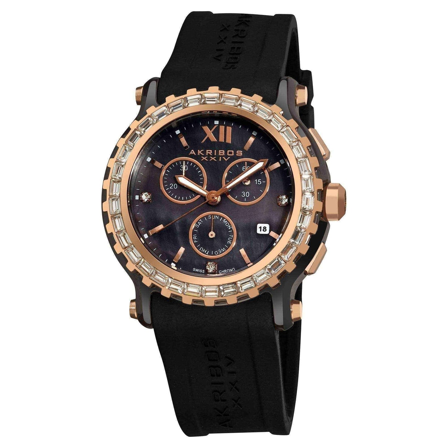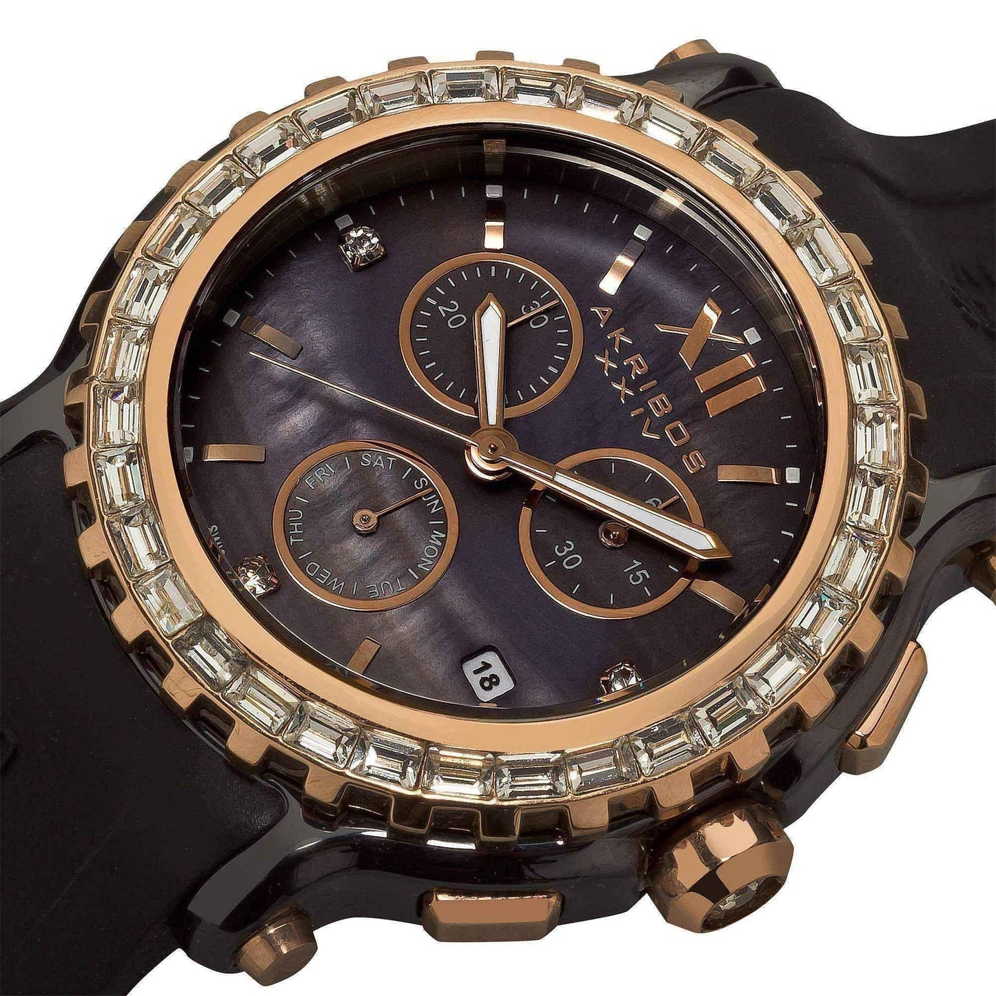 Black and rose gold watch. This lovely ladies Black and rose gold watch by Akribos XXIV features a chronograph timer and beautiful mother of pearl dial.