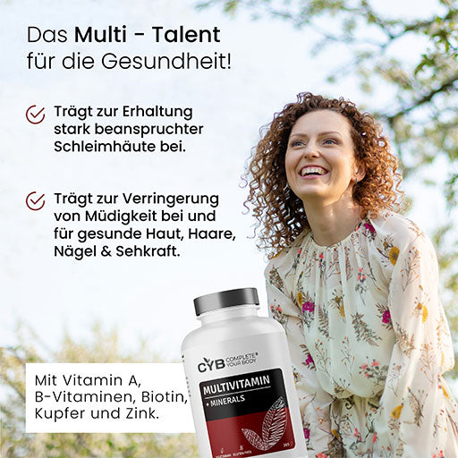 This dietary supplement is a true all-rounder for health. Vitamins B1, B12, iron and magnesium ensure well-being by supporting energy metabolism. Vitamins A, B2, B3, beta-carotene and biotin help to maintain the mucous membranes, which are heavily stressed during the cold season. For the health of the body, it is important that the presence of oxidants and antioxidants is balanced. Vitamins C, E, D, B2, copper, manganese, selenium and zinc capture free radicals and protect against oxidative stress. In addition, vitamins C, B1, B2, B3, B6, biotin, magnesium and copper play an important role in the good functioning of the nervous system.