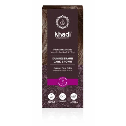 Khadi Dark Brown has been rated "very good" by Öko-Test. Valuable ingredients such as indigo, henna, amla, and bhringaraj ensure a rich, dark color and also cover gray hair. What makes khadi Dark Brown Natural Hair Color special is that it contains the highest indigo content of all brown shades, for an intense color result.