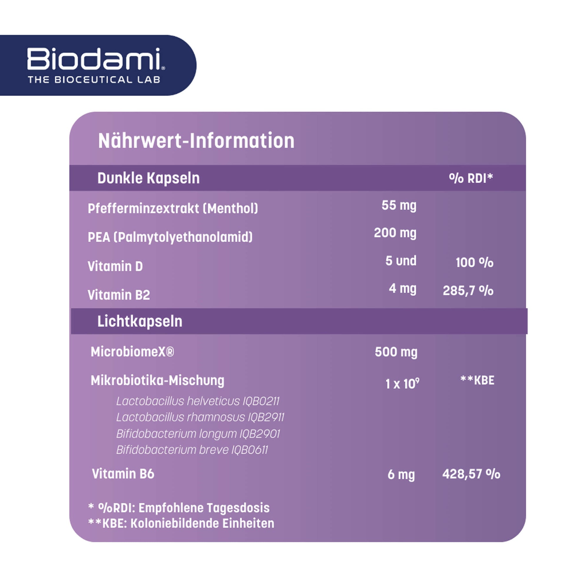 - Dark capsules (1 capsule): Nettle extract (Urtica dioica, leaf, 340 mg), palmitoylethanolamide (PEA, 200 mg), glazing agent (hydroxypropyl methylcellulose), peppermint extract (Mentha piperita, leaf, 55 mg), anti-caking agent (calcium phosphate), olive oil (Olea europaea, fruit, 20 mg), cholecalciferol (vitamin D, 5 µg, 100% RDI*), riboflavin (vitamin B2, 4 mg, 285.7% RDI*).
