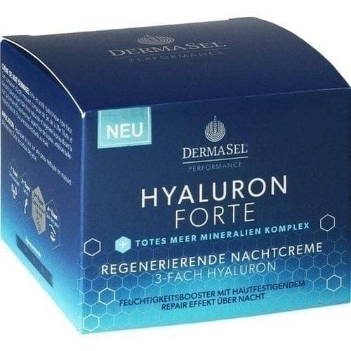 The DERMASEL ® HYALURON FORTE NIGHT CREAM with the innovative active complex with minerals from the Dead Sea and triple hyaluron cushions the skin and makes it appear regenerated overnight. The effective formula ensures a smooth skin feeling, contours that appear more defined, improved resilience and elasticity and lets the skin shine in the morning.