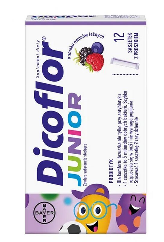 The product is in the form of a forest fruit powder for direct consumption. Each sachet contains up to 5 billion live cultures of Lactobacillus rhamnosus GG bacteria. Dietary supplement Dicoflor Junior is recommended as a supplement to the daily diet with freeze-dried live cultures of probiotic bacteria. The preparation is intended for children over 3 years of age. Lactobacillus rhamnosus GG bacteria support the maintenance of normal intestinal microflora.