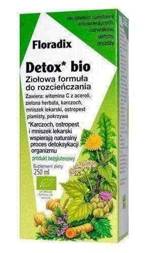 - The Floradix Detox Bio liquid dietary supplement contains herbal water extract, among others from turmeric rhizome, ginger rhizome, milk thistle fruit, birch leaves and dandelion, as well as a portion of vitamin C from acerola. The preparation supports the detoxification process of the body.