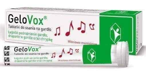 - Gelovox Medical device in the form of lozenges with a cherry-menthol flavor. Gelovox is a moisturizing and protective preparation. Gelovox is recommended if you experience unpleasant throat problems such as pain or dryness.