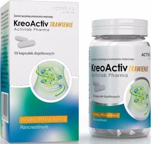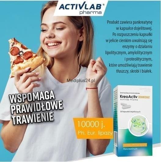 The composition of the KreoActiv Plus dietary supplement contains a mixture - DigeZyme®, i.e. protein enzymes (without animal origin): alpha-amylase, neutral protease, lactase, lipase, cellulase. Supplementing the daily diet with digestive enzymes aids digestion and assimilation of food. In addition, the preparation is recommended as a support for the digestion of lactose. The use of preparations with digestive enzymes may be helpful in people with cystic fibrosis, chronic pancreatitis, pancreatic cancer, as well as in people after removal of the pancreas or stomach, in people with gastrointestinal anastomosis, stenosis of the pancreatic duct or common bile duct (e.g. due to cancer), people with Shwachman-Diamond syndrome and people after an attack of acute pancreatitis and starting enteral or oral nutrition.