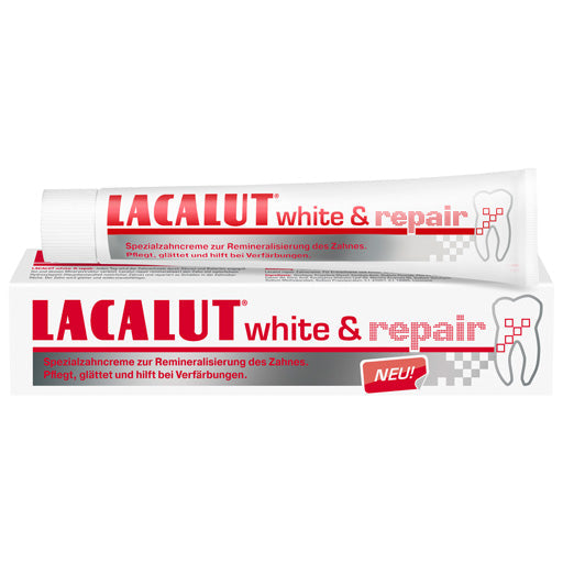 Every day, the tooth enamel is attacked by acids and bacteria and its mineral structure is damaged. Lacalut white & repair toothpaste contains a special combination of active ingredients to care for the teeth. Phosphate compounds ensure a whiter color. Sodium fluoride together with hydroxyapatite - the main component of tooth enamel - supports the remineralization of the tooth surface. The tooth becomes smoother and more resistant. For healthy, white teeth. The RDA value is around 100.