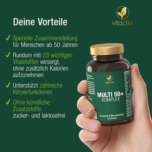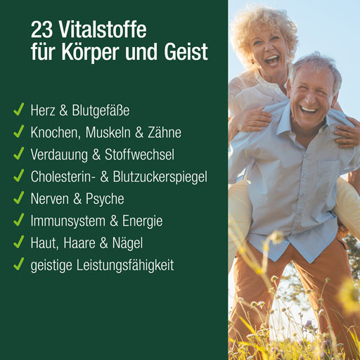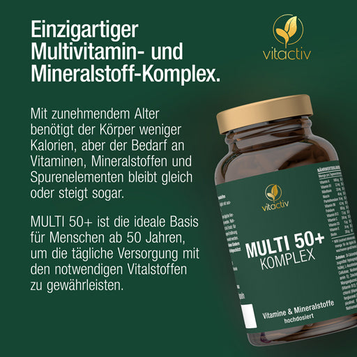 MULTI 50+ is a natural vital substance complex consisting of 23 vitamins, minerals and trace elements in a special dosage for people over 50 years of age.