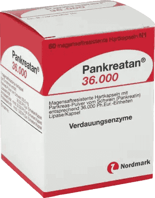 -resistant hard capsules with pancreas powder from pigs (pancreatin) corresponding to 36,000 Ph.Eur. units of lipase/capsule