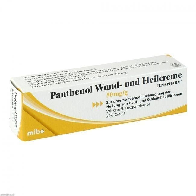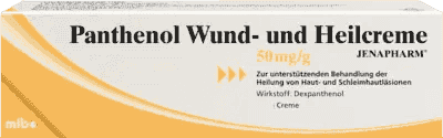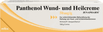 Mandatory text: Panthenol Wound and Healing Cream JENAPHARM ® For supporting treatment of the healing of skin and mucous membrane lesions. Warning: Contains bronopol and wool wax (may contain traces of butylated hydroxytoluene). Avoid contact with eyes. For risks and side effects, read the leaflet and ask your doctor or pharmacist. Status: 10/2018. mibe GmbH Arzneimittel, 06796 Brehna.