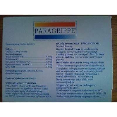Paragrippe Indications: The product is intended for use in the case of flu or colds manifested by headache, muscular joint discomfort, fever and chills.