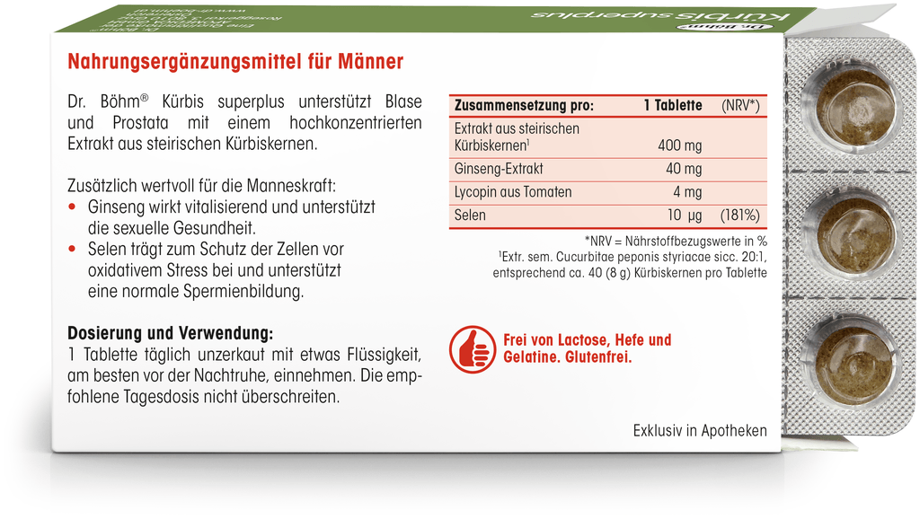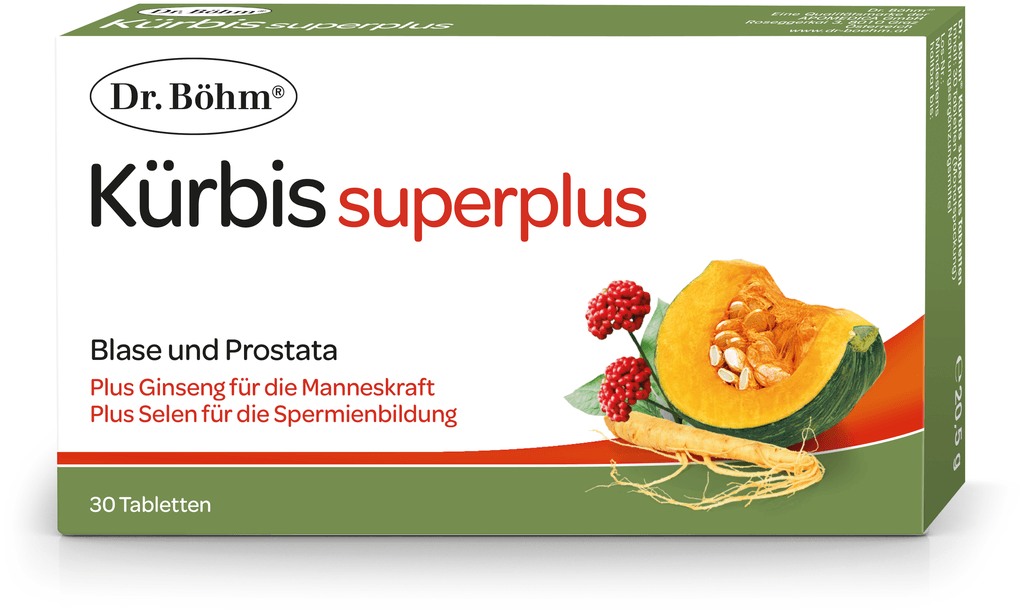 Dr. Böhm® pumpkin superplus tablets were developed to support the bladder, prostate and vital functions of men. They contain a patented extract from Styrian pumpkin seeds.