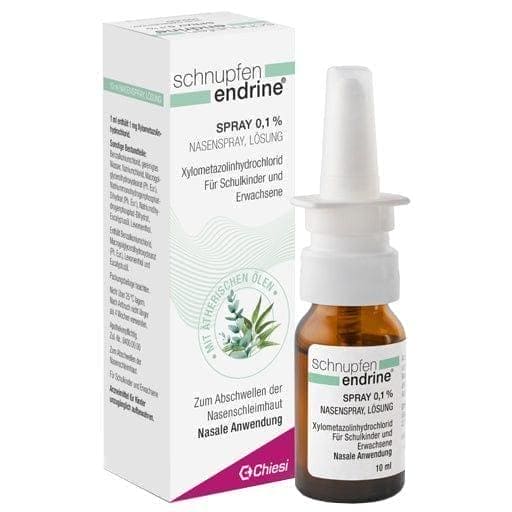 Mandatory text: snuff endrine ® . Active ingredient: xylometazoline hydrochloride. Active substance : 1 ml nasal spray/1 spray of 90 microlitres contains: Xylometazoline hydrochloride 1.0 mg/0.09 mg. Areas of application: For short-term therapy for congestion of the nasal mucous membranes. Intended for adults and school children. Contraindications: Allergy to xylometazoline hydrochloride, eucalyptus oil, levomenthol or any of the other ingredients of endrine ®Aerosol 0.1%. Certain form of a chronic cold (rhinitis sicca). Condition after surgical removal of the pituitary gland through the nose or other surgical procedures that expose the meninges. Children under 6 years old. Patients with bronchial asthma or other respiratory diseases associated with marked airway hypersensitivity. Warnings: Contains benzalkonium chloride, levomenthol and eucalyptus oil. Note leaflet. Pharmacy only. Status: September 2015. Chiesi GmbH, Hamburg. For risks and side effects, read the leaflet and ask your doctor or pharmacist!