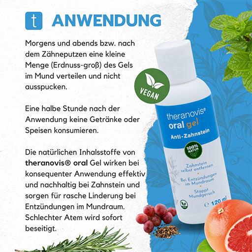 Theranovis ® oral anti-tartar gel combines powerful herbal ingredients with a gentle but effective effect. It was specially developed to dissolve tartar, relieve inflammation in the mouth and neutralize bad breath - all without a visit to the dentist. The thick texture adheres optimally to the teeth and interdental spaces, unfolds its effect in a targeted manner and ensures a healthy, radiant smile.