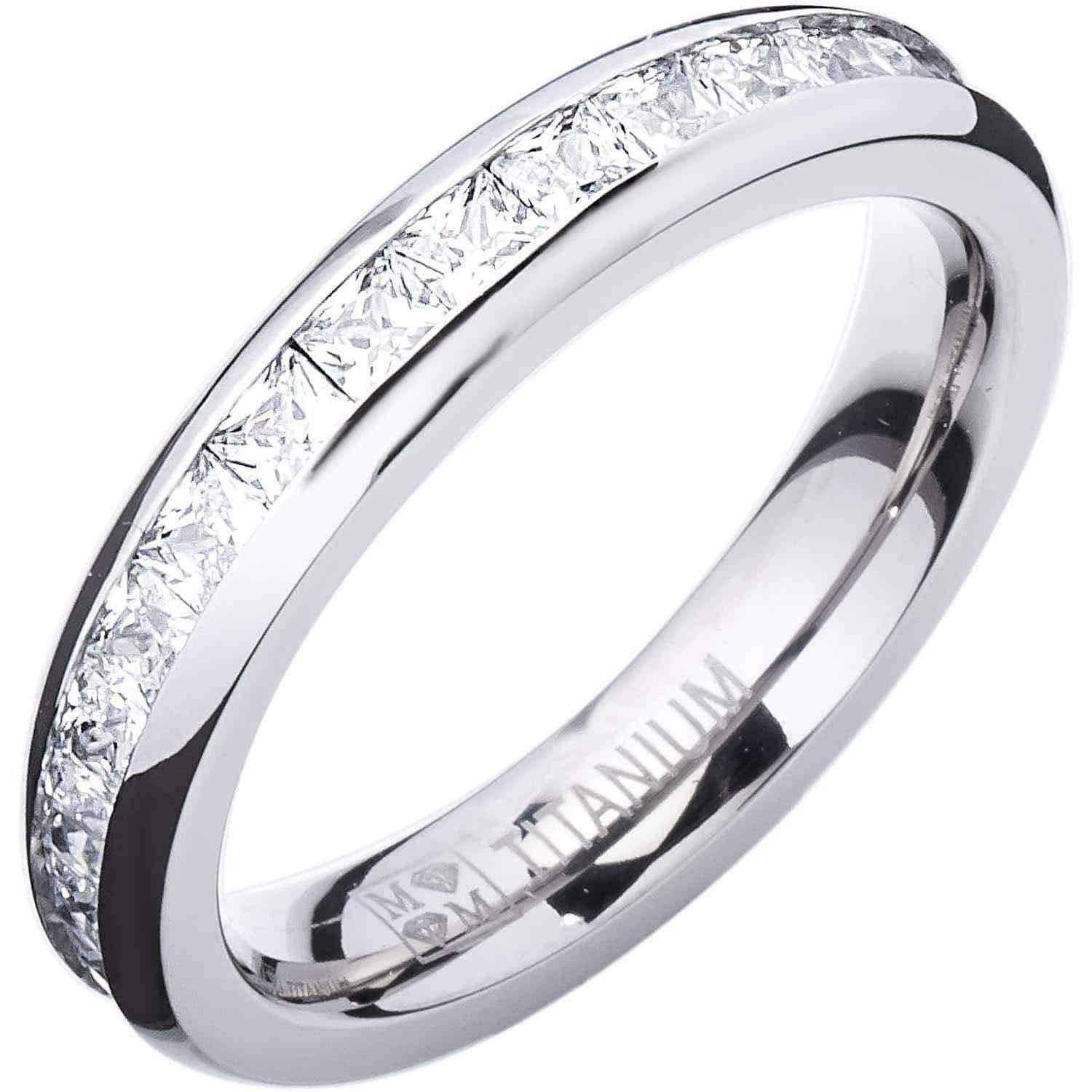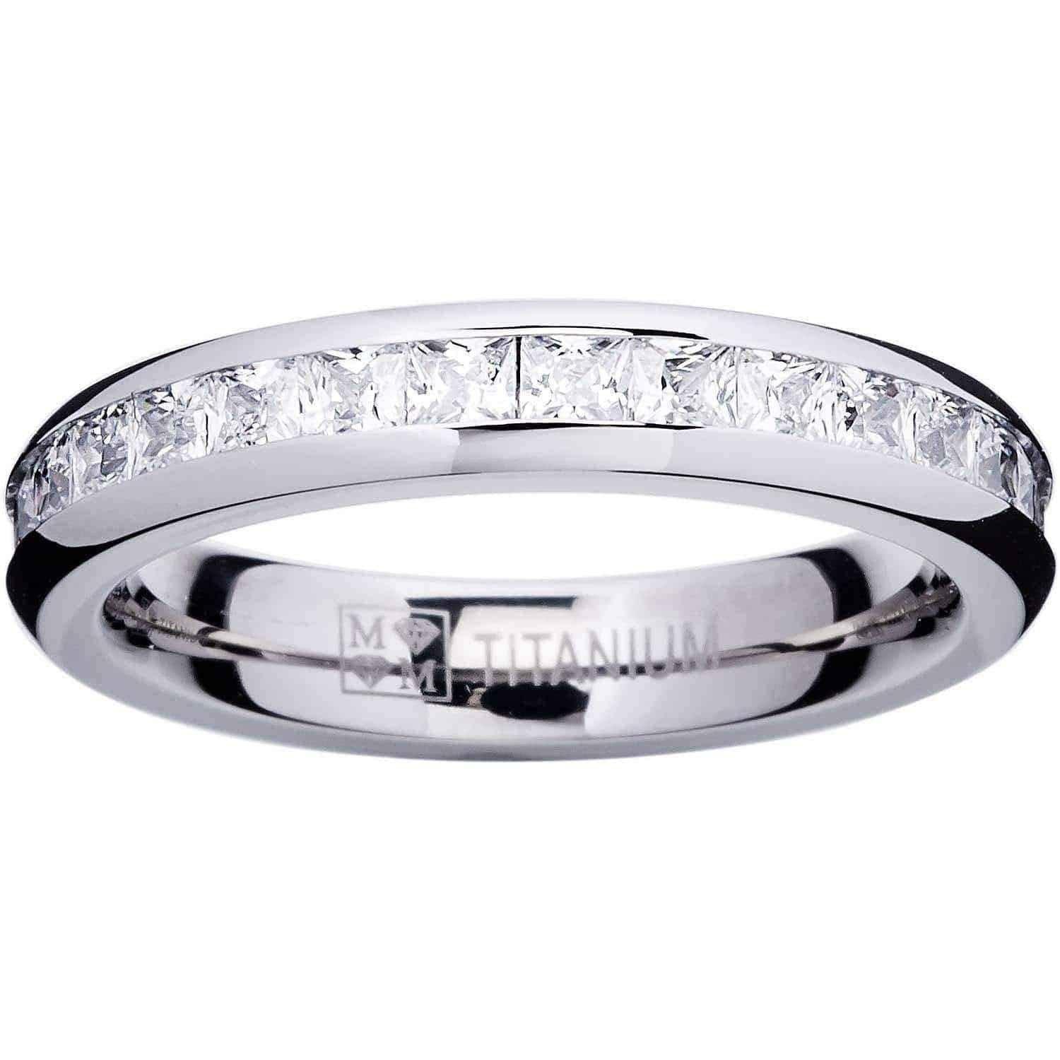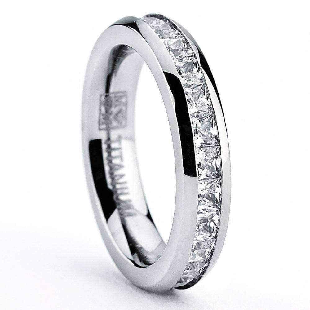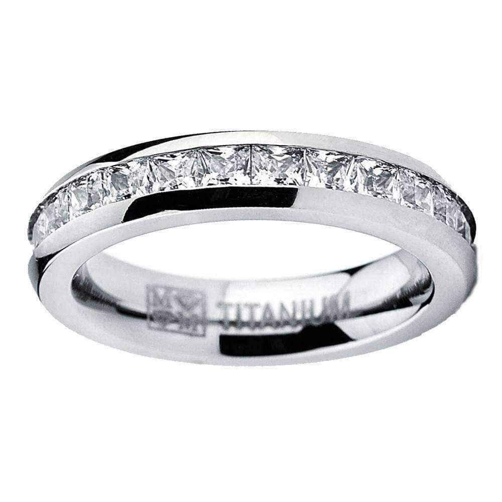 Titanium Eternity Ring. Bright and dazzling, this elegant eternity ring will add romantic sophistication to your life. The highly polished, scratch-resistant band is crafted from lightweight titanium. Glittering, princess-cut cubic zirconia are channel-set across the entire band, creating an endless, shimmering display.