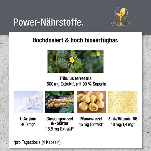 Tribulus extract (Tribulus terrestris L.) with 90% saponin content; coating agent: hydroxypropylmethylcellulose (vegetable capsule shell); filler: microcrystalline cellulose; L-arginine base; L-leucine; zinc gluconate; ginseng root and leaf extract (Panax ginseng) with 30% ginsenosides; maca root extract (Lepidium meyenii); pyridoxine hydrochloride (vitamin B6).