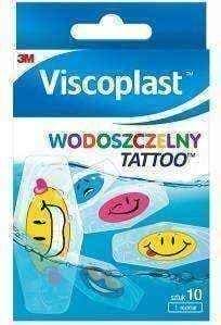 - set of watertight plasters - Viscoplast Tattoo watertight. Slices with colorful prints are a great offer for children. Colorful graphics will make babies forget about injury. The slices provide effective protection against germs and dirt.