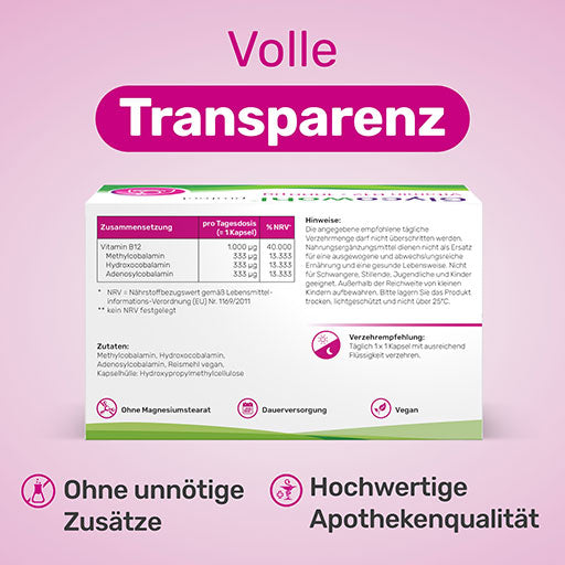 Glycowohl ® protect Vitamin B12 · 1000 μg is a vegan dietary supplement and contains a high dose of pharmacy-quality vitamin B12. The 1000 μg are made up of the three natural forms of vitamin B12: methylcobalamin, adenosylcobalamin, and hydroxocobalamin. Vitamin B12 is a vital vitamin that plays a central role in the human body and significantly reduces tiredness and fatigue. 1