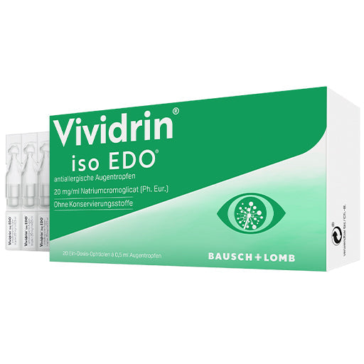 Vividrin ® iso EDO ® in practical single-dose ophthalmic drops is a gentle solution for allergic, acute, and chronic conjunctivitis. The active ingredient sodium cromoglicate helps quickly and reliably relieve typical symptoms of allergically irritated eyes, such as redness, itching, eyelid swelling, photosensitivity, and increased tearing.